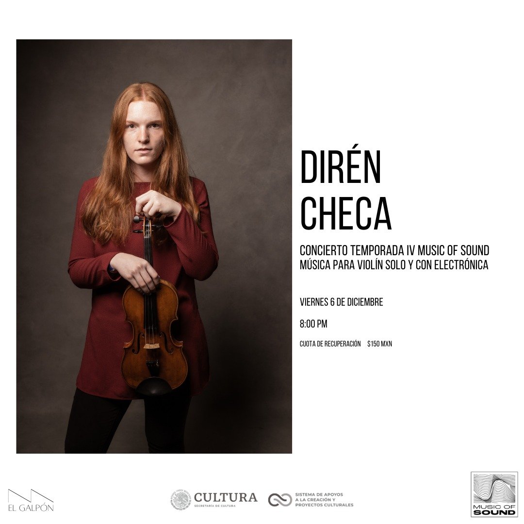 Dirén Checa (Ciudad de México, 1997) es una violinista y artista sonora mexicana dedicada a interpretar música nueva, colaborar con compositores vivos y crear experiencias sonoras vanguardistas y accesibles. Comenzó a tocar el violín a los 8 años, estudiando con Frasin Vlad de la Filarmónica de la Ciudad de México. Continuó su formación en la preparatoria con enfoque en violín en Interlochen Arts Academy, Michigan, y obtuvo la Licenciatura en Música con especialización en Ejecución de Violín de Eastman School of Music en Rochester, NY. Ha sido alumna de Adrian Justus, Federico Agostini, Bin Huang y Paul Sonner, y ha participado en clases magistrales con músicos destacados como Irvine Arditti, Martin Chalifour e Igor Petrushevski.