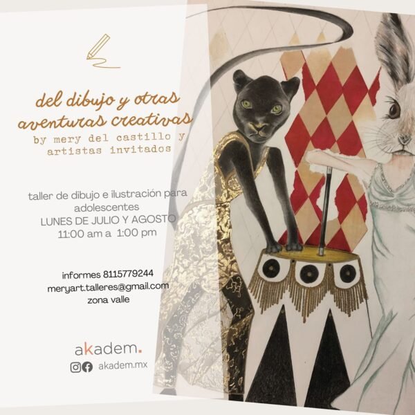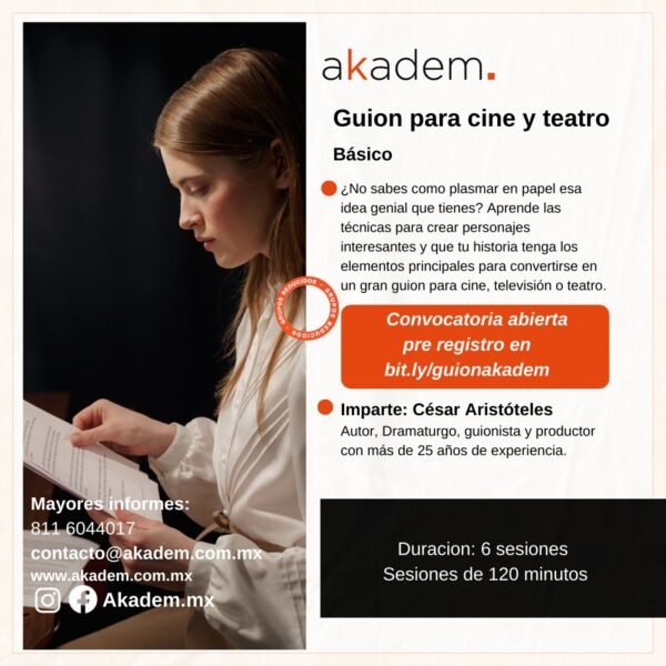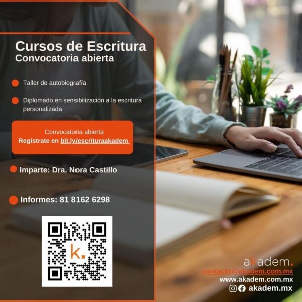Convocatoria abierta – ¡Regístrate! bit.ly/escrituraakadem – Duración: 12 sesiones | 2 horas cada una – Disciplina: Literatura – Imparte: Dra. Nora